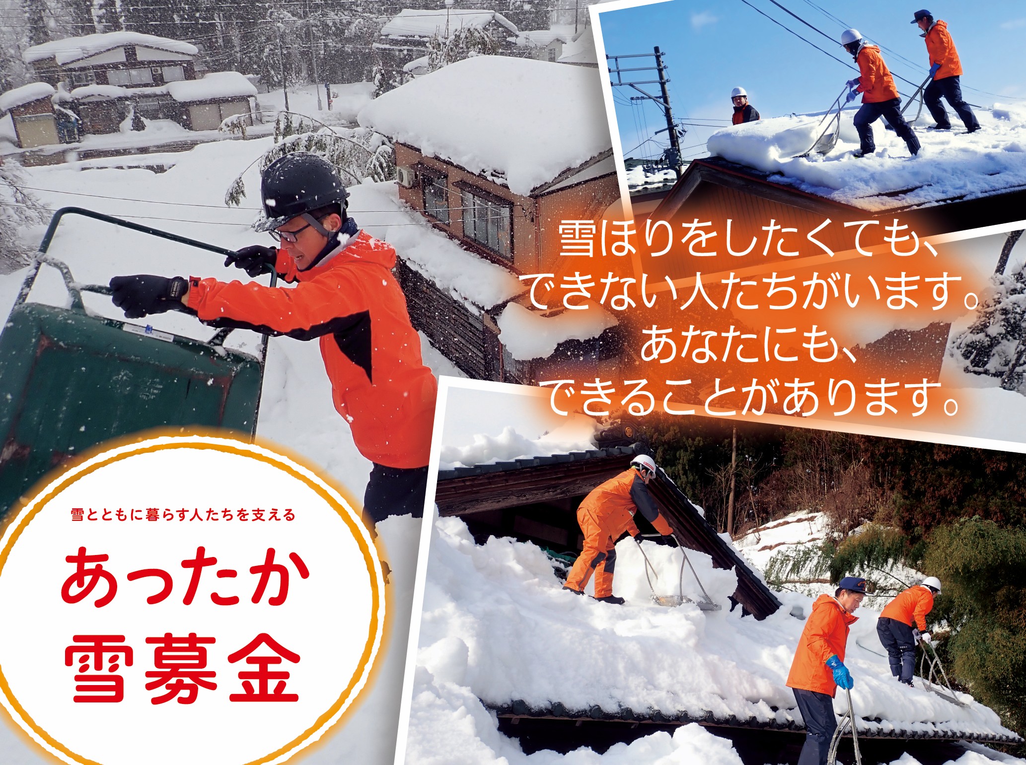 新潟県共同募金会では、1月1日から3月31日までの3か月間、雪国応援を目的とした「あったか雪募金」を募集します。お寄せいただいた募金は、高齢者や障害のある方など、自力での除排雪ができない世帯等を支援する除雪ボランティアグループ等の活動支援に使われます。ふるさとを離れている方々からの雪国支援のほか市民の皆様からも振込用紙や募金箱等でご寄附いただけます。いつまでも安心して住み続けられるふるさとにするために、ご理解とご協力をお願いします。