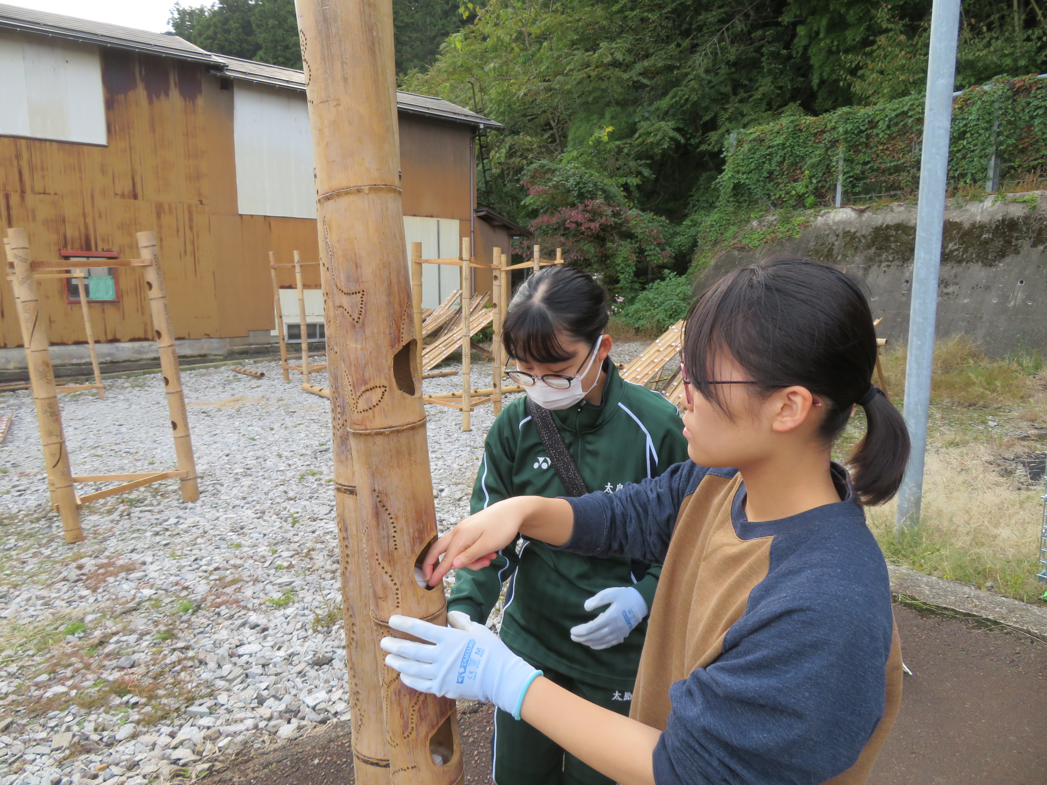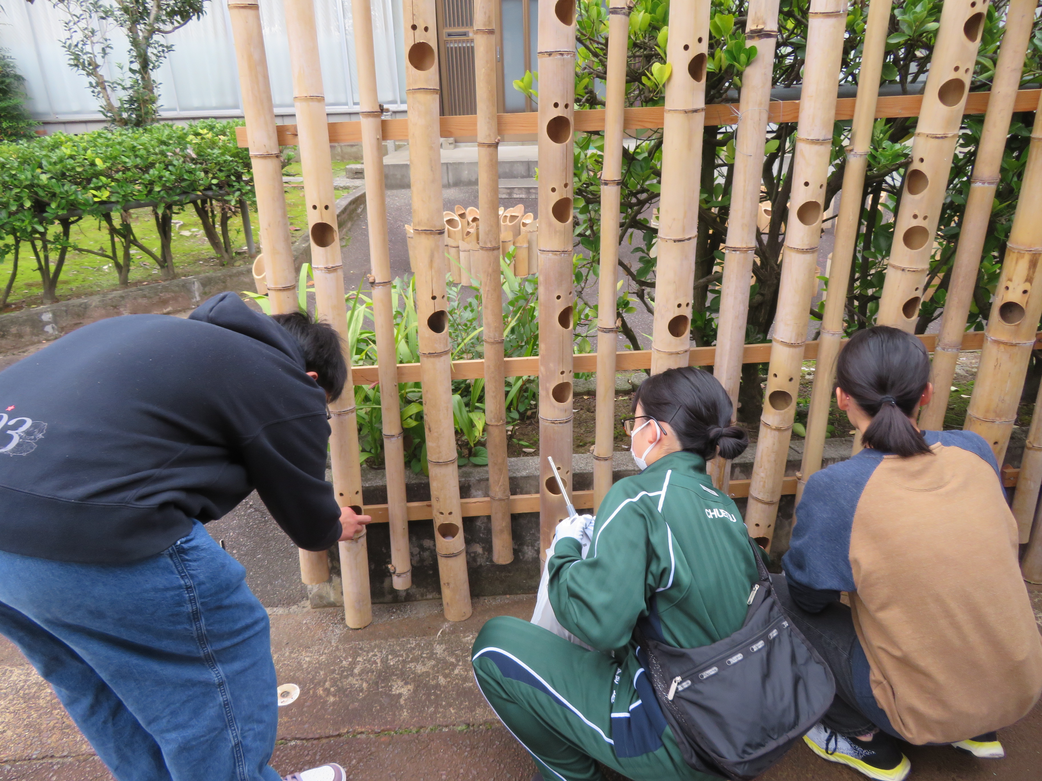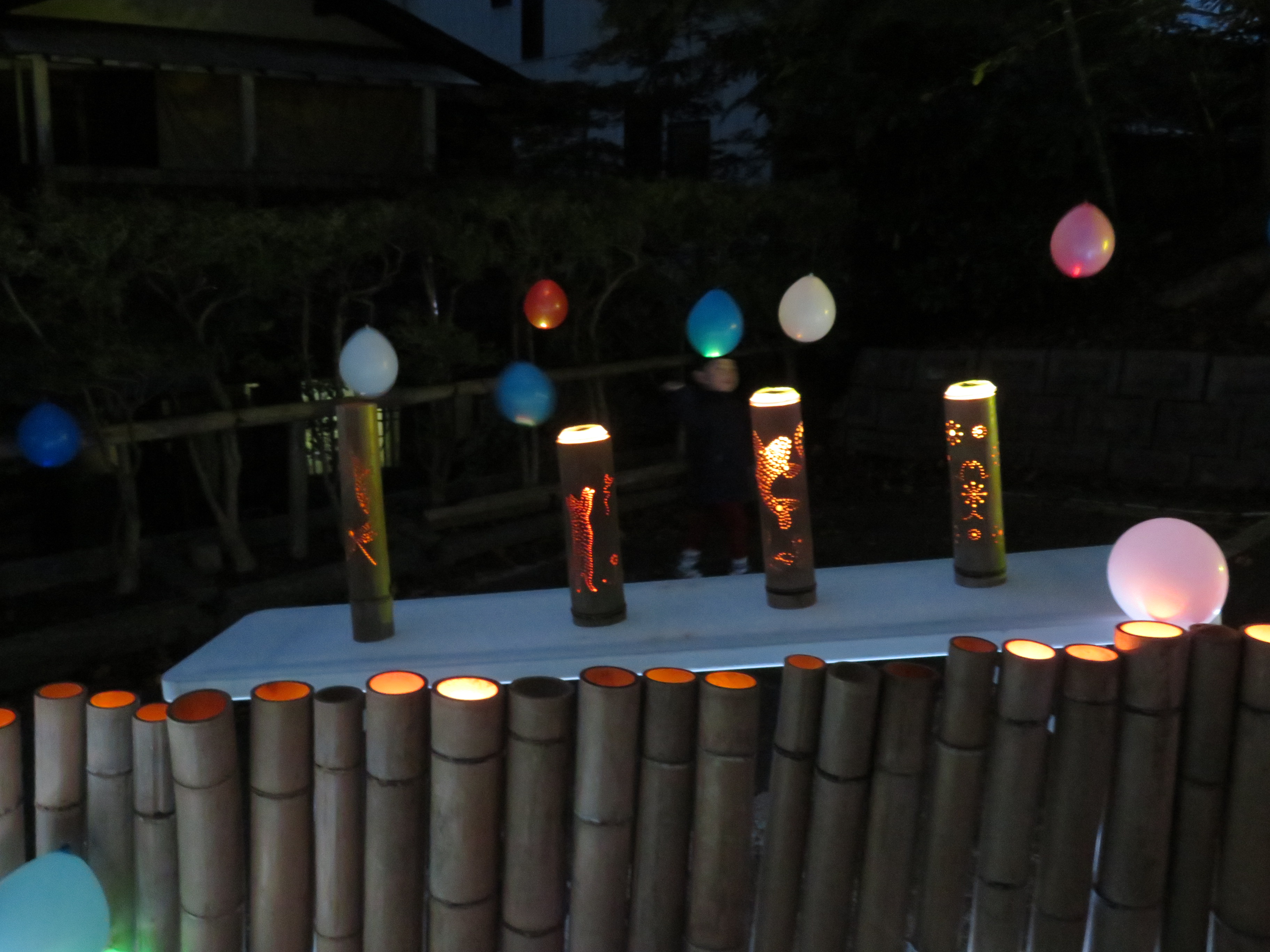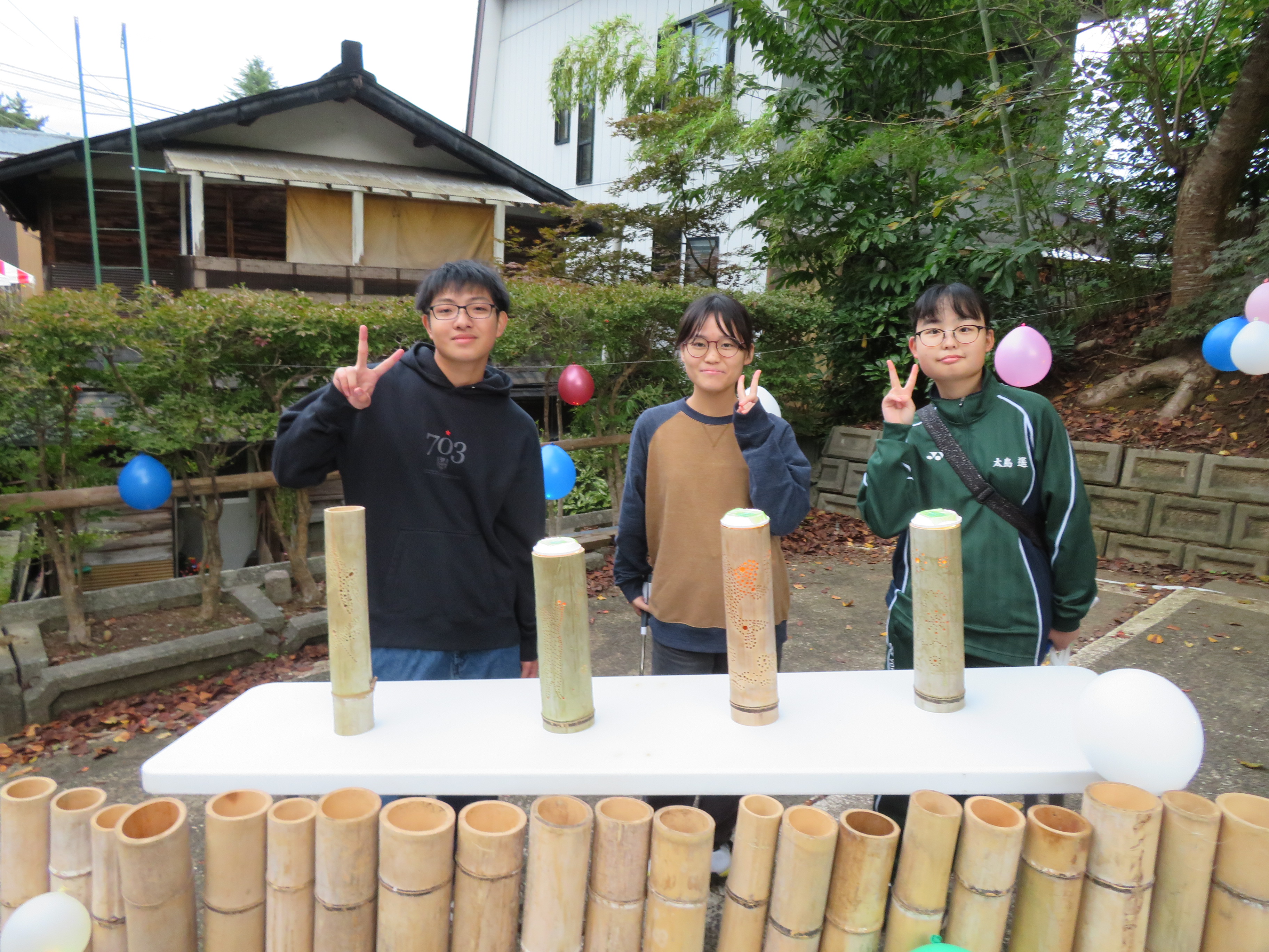 7月の高校生ボランティア講座に参加してくれた3人と当日の準備に参加し、7月に作成した竹灯籠を展示し、イベント内で灯されました。