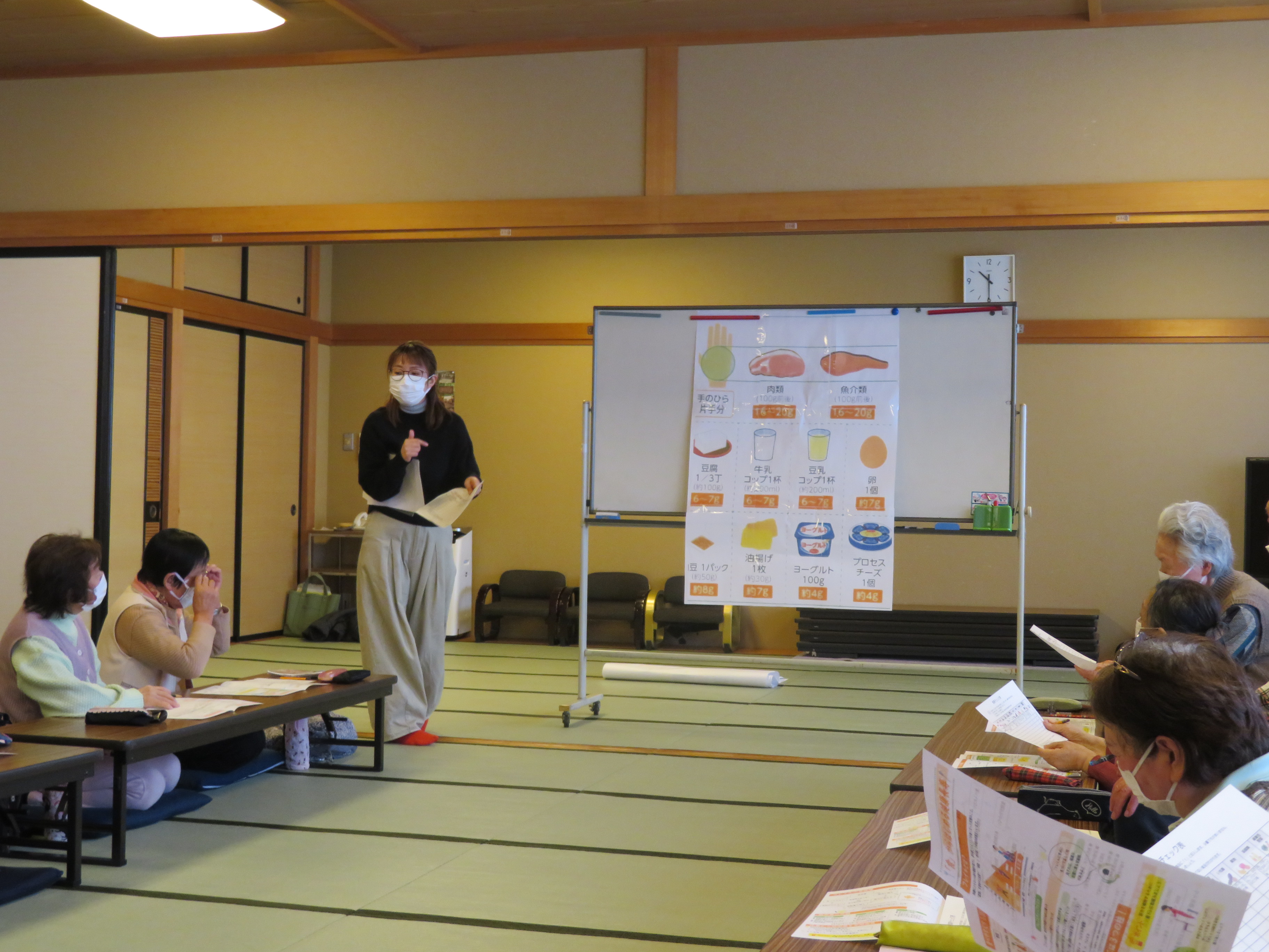たんぱく質や糖質(エネルギー)が不足すると低栄養になりやすいこと、低栄養を防ぐための食事についてなどの説明をいただきました。加えて、フレイル予防のための筋力維持の体操もみんなで取り組みました。